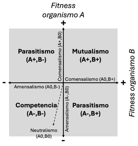 En secciones posteriores vamos a realizar una comparación formal entre las leyes de la robótica de Isaac Asimov y el paradigma actual para el diseño de bioartefactos autónomos. Para facilitar este análisis, vamos a hacer uso de representaciones gráficas de las interacciones entre individuos desarrolladas para las ciencias sociales y más tarde adaptadas a la biología [20, 21]. Dados dos agentes autónomos A y B que interactúan (podemos pensar en un primer momento en dos seres humanos o dos seres vivos no humanos), podemos definir un plano que tiene en cuenta si su fitness o bienestar aumenta, se mantiene estático o disminuye como resultado de la interacción (Figura 2). Podemos representar el bienestar del agente A en el eje Y y el bienestar del agente B en el eje X. Cuanto más nos alejamos del origen, más fuerte es el efecto de la interacción en el fitness de los agentes autónomos. Si la interacción no cambia el fitness de ninguno de los dos agentes, nos encontramos en el origen de la gráfica y la interacción se conoce como “neutralismo”. En el cuadrante superior derecho de la gráfica, el fitness de ambos agentes aumenta como resultado de la interacción. Esta interacción recibe el nombre de “mutualismo”. En el cuadrante inferior izquierdo de la gráfica, el fitness de ambos agentes disminuye como resultado de una interacción de “competencia”. En los otros dos cuadrantes la interacción aumenta el fitness de un agente y disminuye el fitness del otro, una situación que conocemos como “parasitismo”. Los semiejes en los que el fitness de un agente no cambia y el fitness del otro agente aumenta se denominan “comensalismo”, mientras que los semiejes en los que el fitness de un agente no cambia y el fitness del otro agente disminuye se denominan “amensalismo”. Dado que A y B son agentes en principio equivalentes, la gráfica es simétrica, con dos cuadrantes de parasitismo, dos semiejes de comensalismo y dos semiejes de amensalismo.