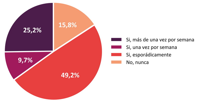Comparativamente, los datos de la última encuesta disponible de consumo en hogares de Argentina (2017-2018) indican que un 38% de los hogares adquieren el producto semanalmente, dato que se asemeja a la frecuencia de consumo regular reportada en este trabajo (una vez por semana o más). Si bien los enfoques de ambos estudios difieren - uno mide el consumo individual y el otro la compra a nivel hogar - el yogur mantiene una presencia habitual en la dieta de una parte significativa de la población [11].
