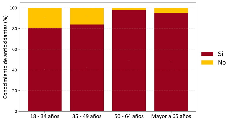 Figura 7: Conocimiento sobre antioxidantes según rango etario. Cada barra muestra el 100% de los individuos de cada rango de edad, desglosado por su respuesta a la pregunta: “¿Sabías que el consumo de antioxidantes favorece el bienestar general?”.